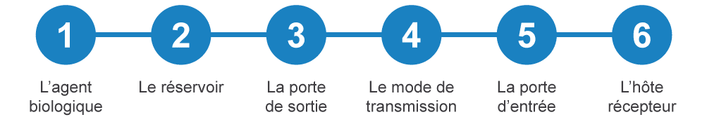 On appelle l’ensemble “la chaîne de transmission de l’agent biologique”. Pour qu’il y ait transmission, il faut bien sûr qu’il y ait un agent biologique (1) dans la chaîne (exemples : virus Sars-cov-2, bactérie Yersinia pestis, …).