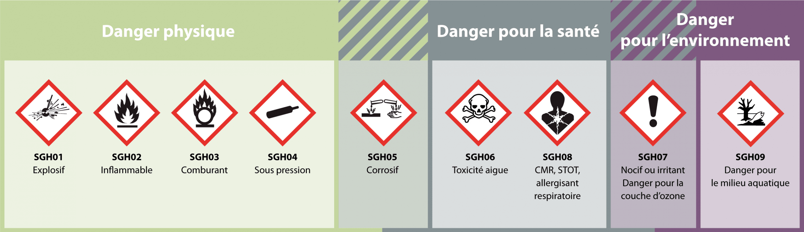 - Dangers pour la santé : Ils se rapportent aux effets que les substances peuvent avoir sur la santé humaine (ex : toxicité aiguë, irritation cutanée, sensibilisation respiratoire).
