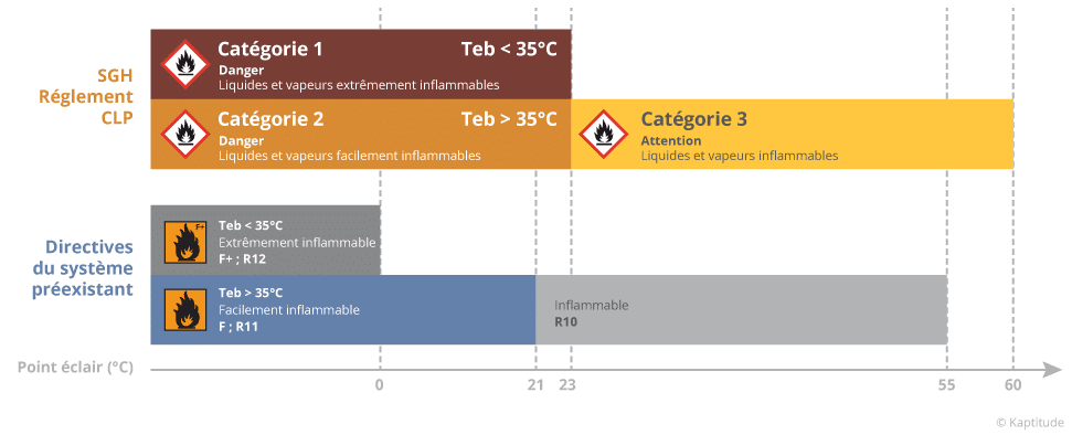 Dans le SGH, les liquides inflammables de catégorie 1 et 2 ont un point éclair inférieur à 23°C. Alors que dans l’ancien système européen (picto oranges) le frontière était à 21°C entre inflammable et facilement inflammable et à 0 °C pour les extrêmement inflammables.