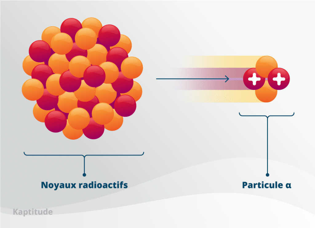 Les particules α sont émises par des noyaux radioactifs de masse importante, comme l’uranium ou le radium. Elles sont composées de deux protons et de deux neutrons, et sont donc chargées positivement.