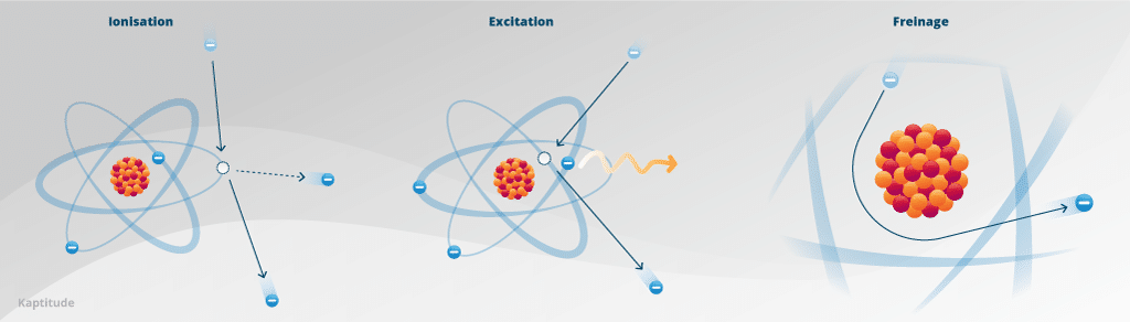 Un électron β- va perdre son énergie cinétique par interactions successives avec les constituants de la matière. Selon la nature de ces constituants (électrons du cortège ou noyaux), l’électron va interagir différemment.