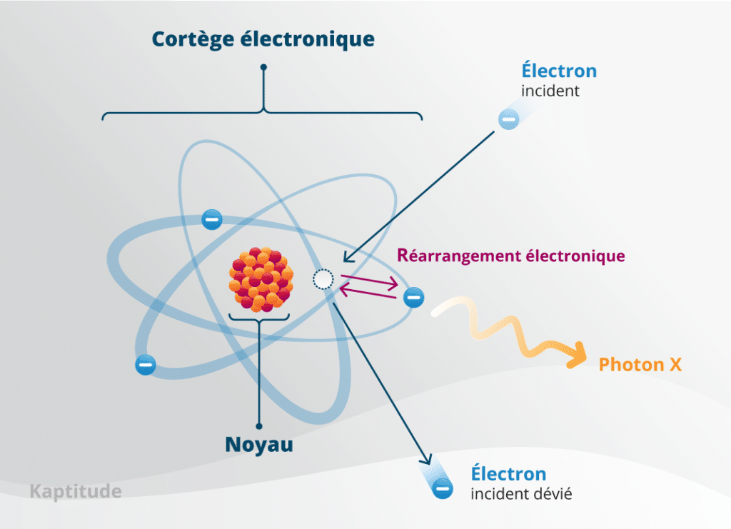 Cette énergie perdue par l’électron est alors émise sous forme d’un rayonnement électromagnétique X de faible énergie (photon lumineux X), de quelques keV seulement.