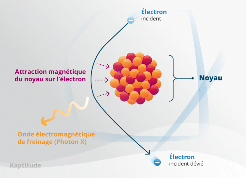 L’électron subit l’attraction des charges positives du noyau : il est dévié et ralenti. Par ralentissement, il perd ainsi une partie de son énergie cinétique sous la forme d’une onde électromagnétique, dite de freinage