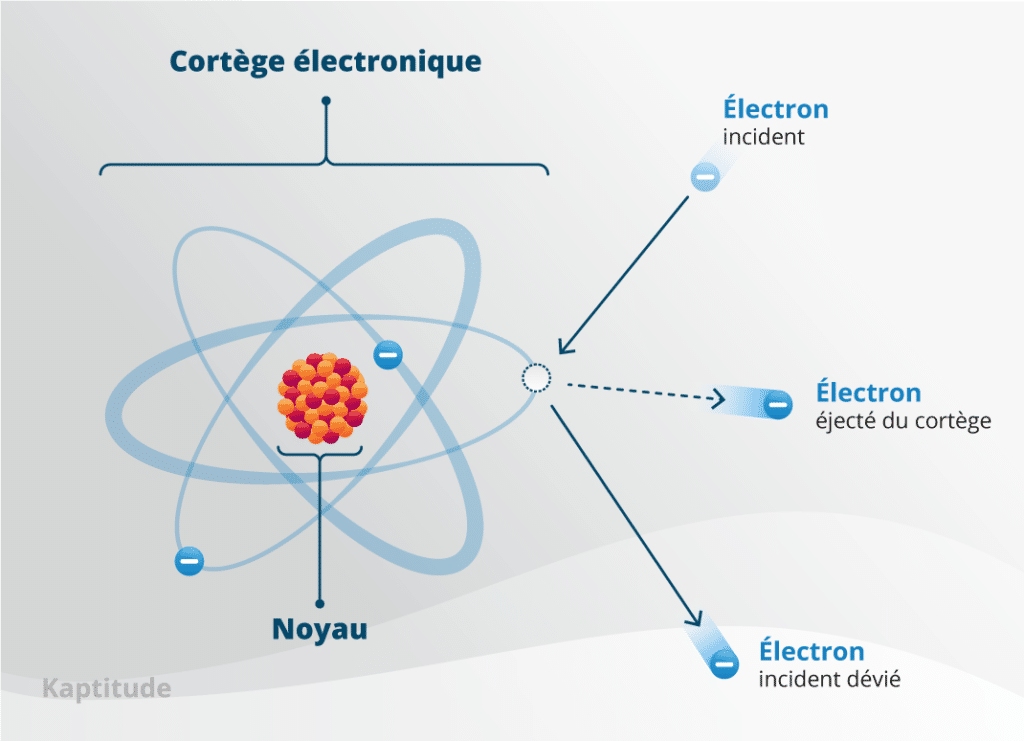 Le plus fréquemment, un électron β- va rencontre un des électrons présents dans le cortège électronique d’un atome. En percutant cet électron, il va lui transmettre une partie de son énergie.