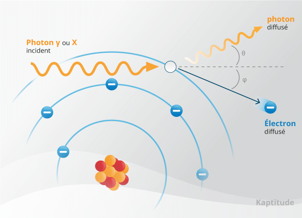 À plus forte énergie, le principal mécanisme devient l’effet Compton : le rayon incident transfère toute son énergie à un électron faiblement lié d’une couche externe. Il est donc plus facilement éjecté, et emporte avec lui une partie de l’énergie du rayon électromagnétique incident. Cet électron est diffusé suivant une direction φ et perdra son énergie par ionisation comme une particule β-.
