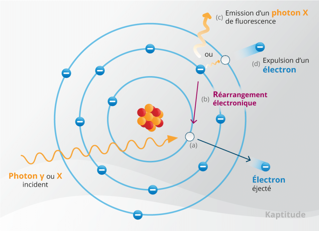 L’électron se retrouve alors éjecté du cortège car l’énergie transférée est plus forte que son énergie de liaison. En général, cet électron (particule β-) est dévié après l’interaction et interagit à son tour dans la matière, en transférant son énergie par ionisation, excitation et peut-être par freinage.
