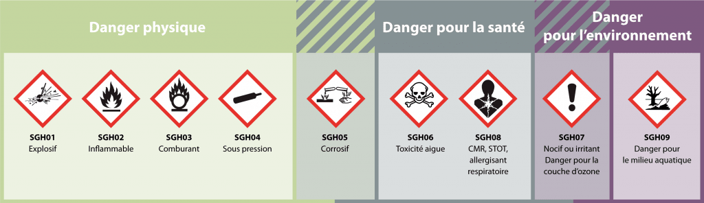 Il existe neuf pictogrammes de dangers chimiques classés en trois familles :