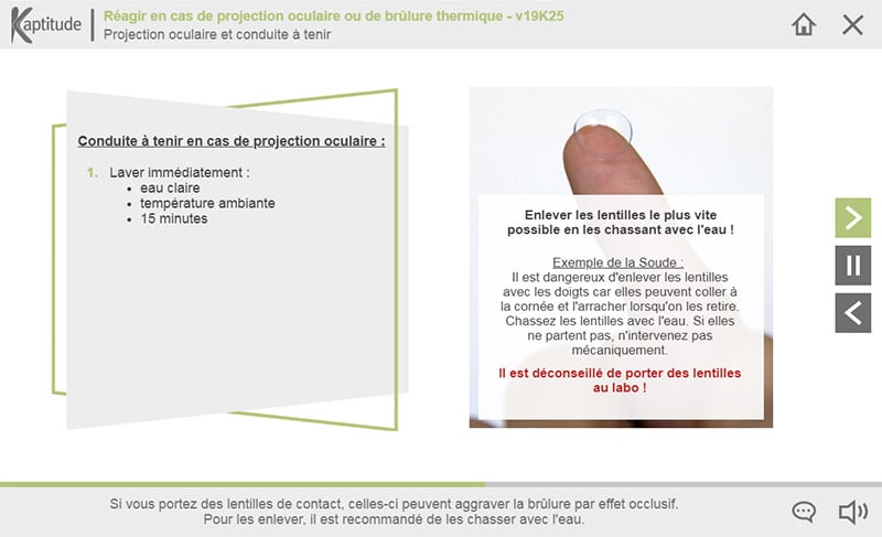 • Apprendre à réagir de façon adaptée en cas de renversement de produits chimiques ou de projection sur le corps ou dans les yeux.