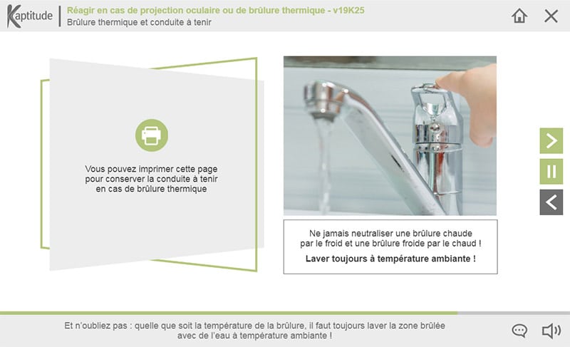 • Comprendre l’importance de la rapidité d’action que ce soit pour stopper un incendie ou réduire l’impact d’une brûlure chimique.