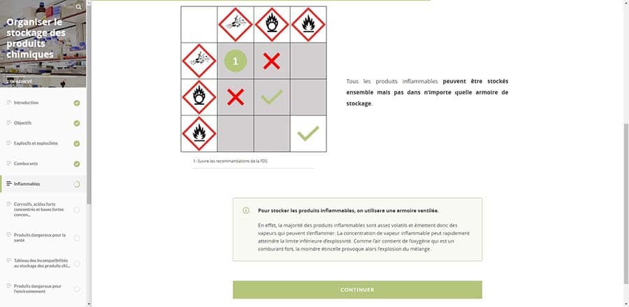 Cette formation permet d’explorer la réactivité des produits chimiques pas à pas et de construire un tableau résumant les incompatibilités. Ce tableau pourra notamment être utilisé pour organiser le stockage des agents chimiques dangereux en toute sécurité. La formation adresse également le stockage des produits portant plusieurs pictogrammes. Enfin, elle passe en revue les armoires de stockage appropriées à chaque famille de produits.