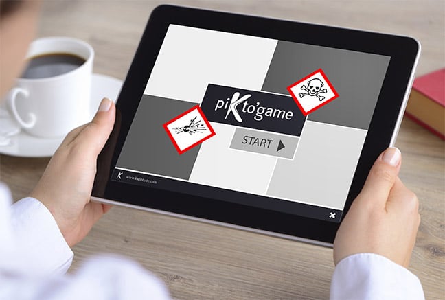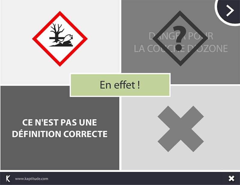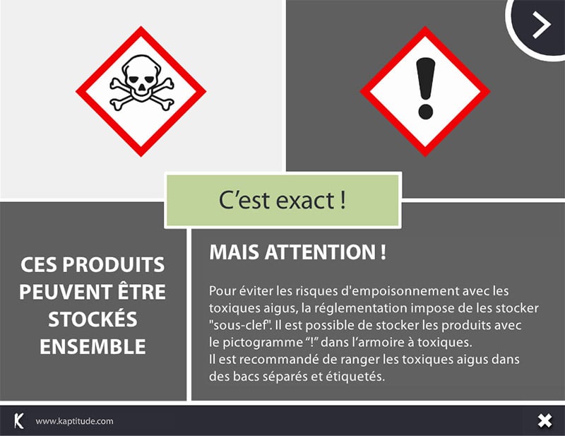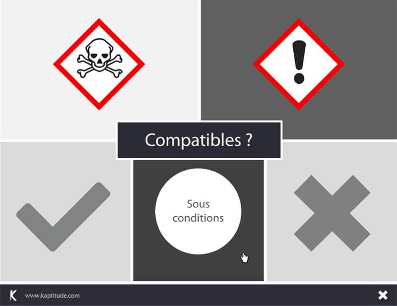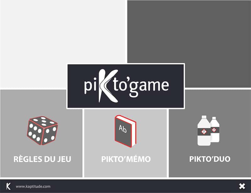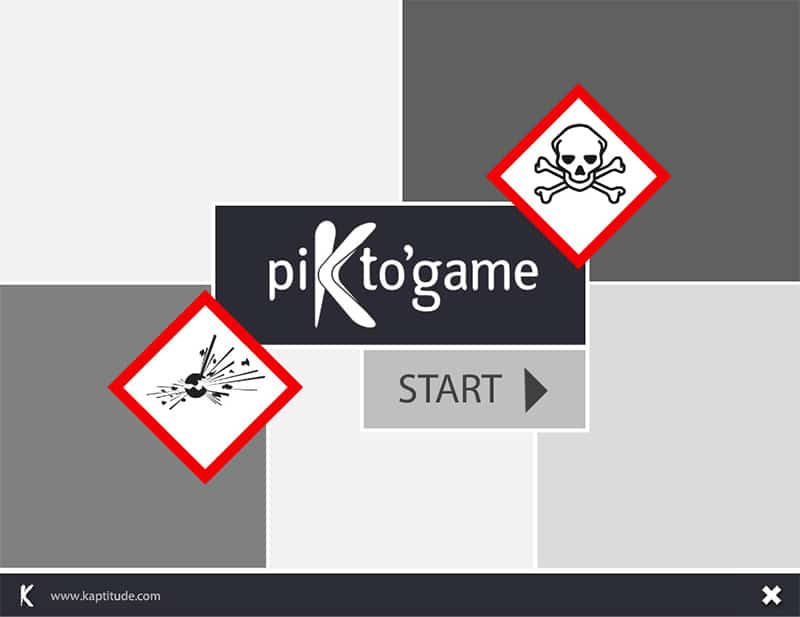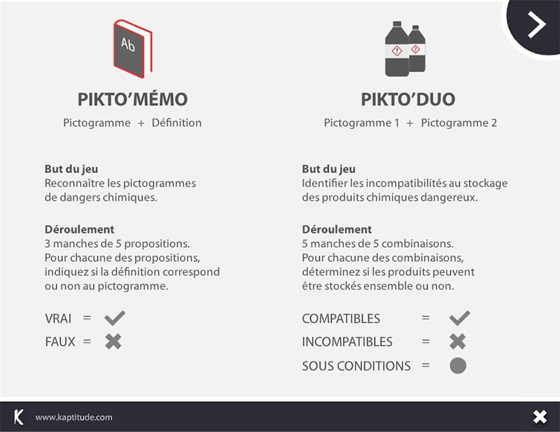 Pikto’game est organisé en deux jeux indépendants. Le premier permet de revoir la définition exacte de chacun des pictogrammes du SGH. Le second adresse la problématique des incompatibilités par combinaison de deux pictogrammes. Le correctif fournit de précieuses informations complémentaires sur les règles de stockage des produits chimiques dangereux.