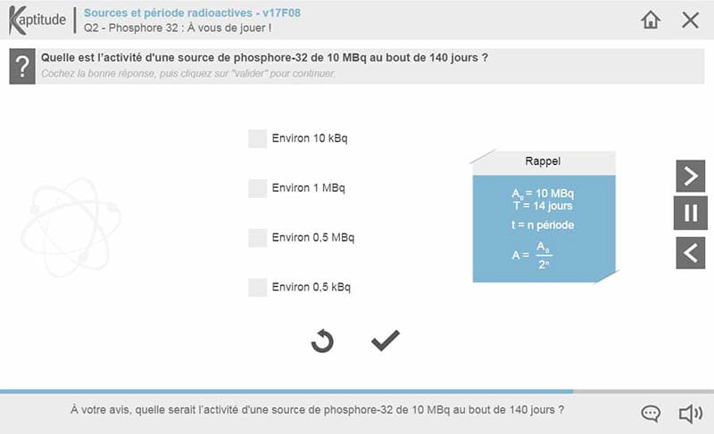 Le concept d’activité d’une source et le calcul de son activité en fonction du temps sont présentés dans ce module. L’utilisation de ces deux grandeurs en médecine, en recherche ou en industrie illustre concrètement les deux notions.
